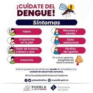 Asimismo, Soria Córdoba recordó a las y los poblanos que viven en las zonas endémicas a seguir las indicaciones de las autoridades sanitarias; principalmente mantener limpios patios y cacharros, así como acudir a la unidad médica más cercana en caso de presentar síntomas como fiebre, náuseas o sarpullido para recibir el tratamiento oportuno.