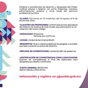 Puebla, Pue.- El Poder Judicial del Estado de Puebla y la Benemérita Universidad Autónoma del Estado de Puebla (BUAP) convocan a estudiantes de Derecho y abogados titulados a participar en el Primer Diplomado en Actualización sobre el Nuevo Código Nacional de Procedimientos Civiles y Familiares, el cual se llevará a cabo de agosto a diciembre de 2024.