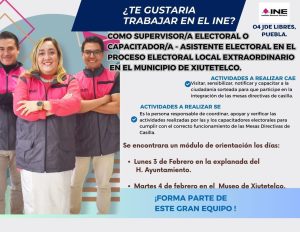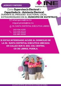 Rafael García Pérez, Vocal de Capacitación Electoral y Educación Cívica en la Junta Distrital Ejecutiva 04 del INE con cabecera distrital en Libres, dio a conocer la convocatoria para el reclutamiento, selección de supervisores, capacitadores y asistentes electorales para la capacitación de los funcionarios de casilla que participarán en la elección extraordinaria del domingo 23 de marzo, en que se elegirá presidente municipal y cabildo.